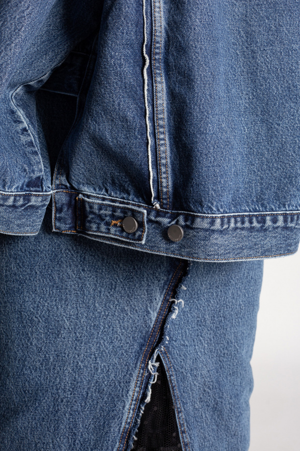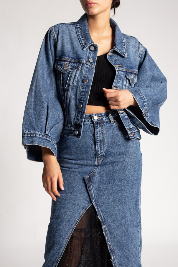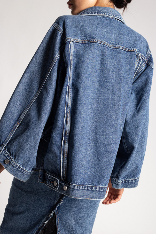 Blue asymmetrical denim jacket from Red Valentino. Fastened with buttons, this design features decorative stitching details, two front pockets, two buttoned flap pockets and long wide sleeves with button cuffs.