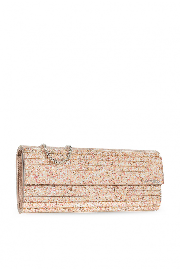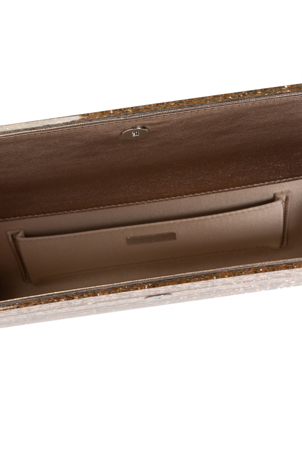 Gold-tone ‘Sweetie’ clutch from Jimmy Choo. Made of lamb leather, this pair features a magnetic snap, silver-tone, pink and gold-tone glitter, embossed logo, shoulder chain, silver-tone brass hardware and one internal compartment with one card slot.