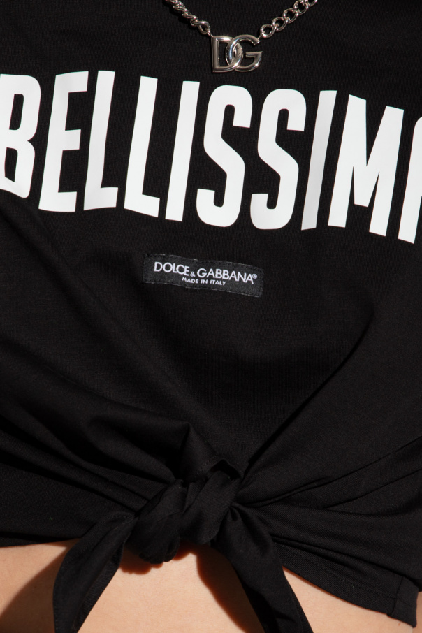 Black tank top from Dolce & Gabbana. Made of cotton, this style features a white graphic print, a logo patch and a tie detail at the hem.