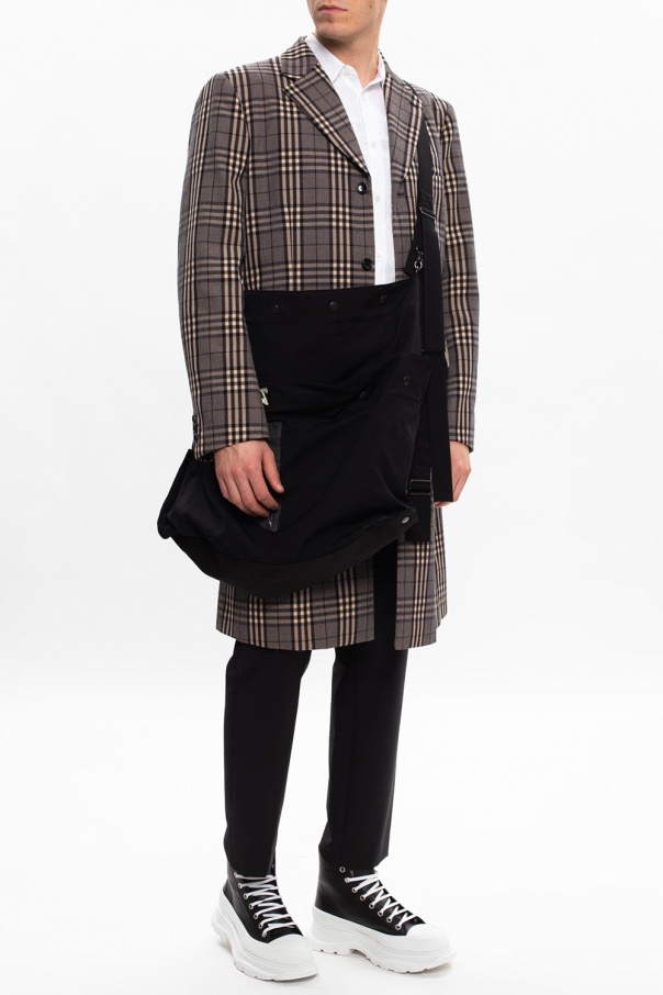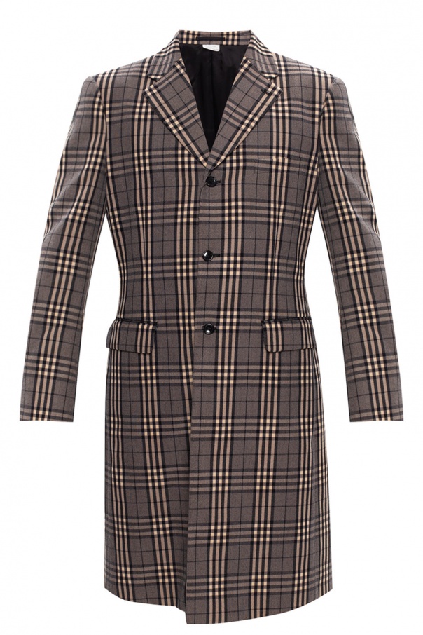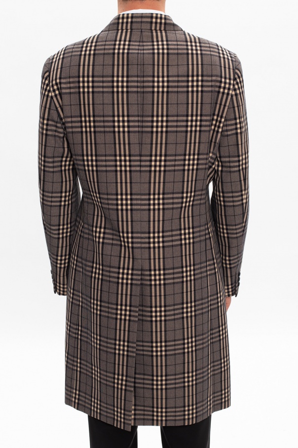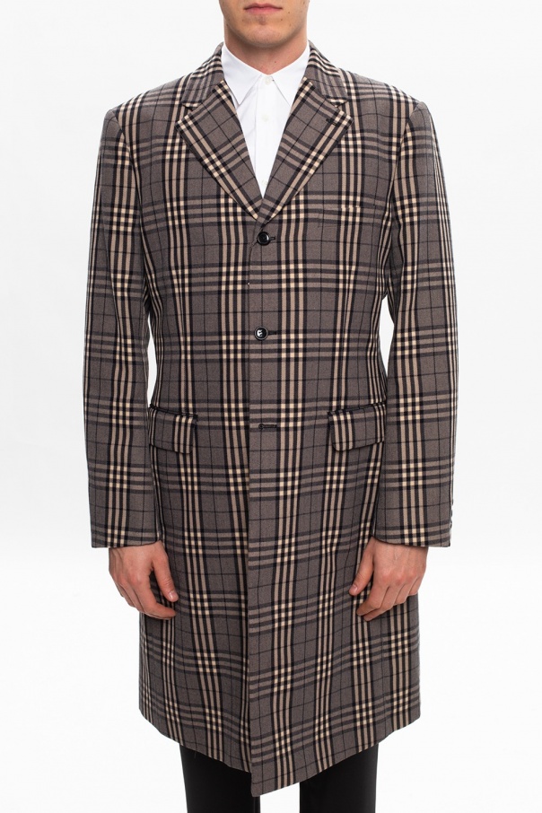 Grey, white and black coat from Alaia. Illustrated with the checked pattern, this exclusive piece of outerwear employs notched lapels, two flapped pockets on the front and single vent on the back.