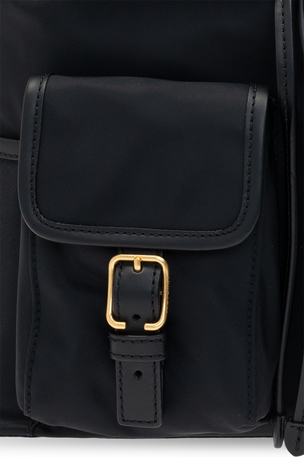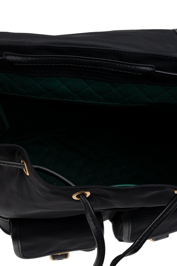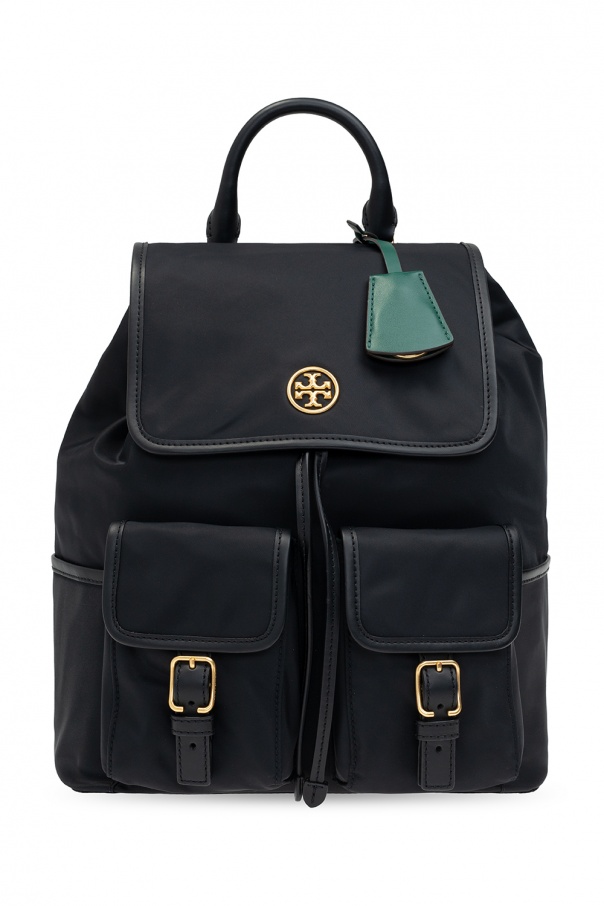Black ‘Piper’ backpack from Tory Burch. Trimmed with leather, this item features multiple pockets, drawstring and magnetic closures, metal logo detail, half-round handle, adjustable shoulder straps and gold-tone metal hardware. The interior includes one internal compartment in green with one zip pocket and one slip pocket.