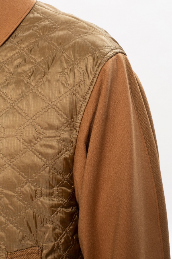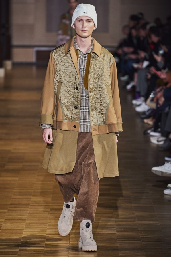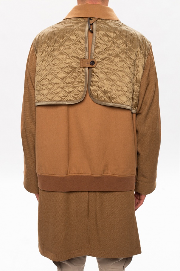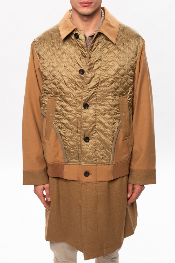 Brown and green layered coat from White Mountaineering featuring button fastening, two jetted pockets, two snap-fastened pockets and quilted lining.