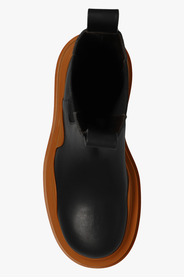 Black ‘Tire’ platform Chelsea boots from Bottega Veneta. Made of calf leather, this pair features elastic side panels and brown rubber sole.