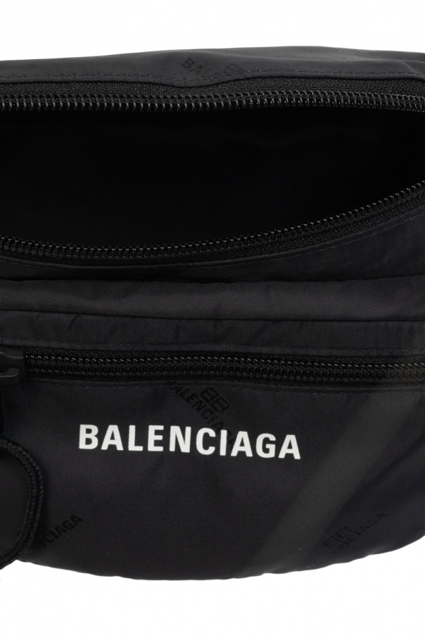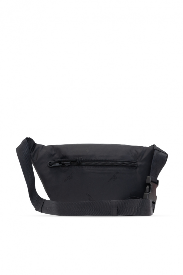 Black belt bag from Balenciaga. Printed with the brand's logo in white, this design fastens via a zip and features two zipped pockets on the front and at the back, an adjustable strap with a buckle and one internal compartment.