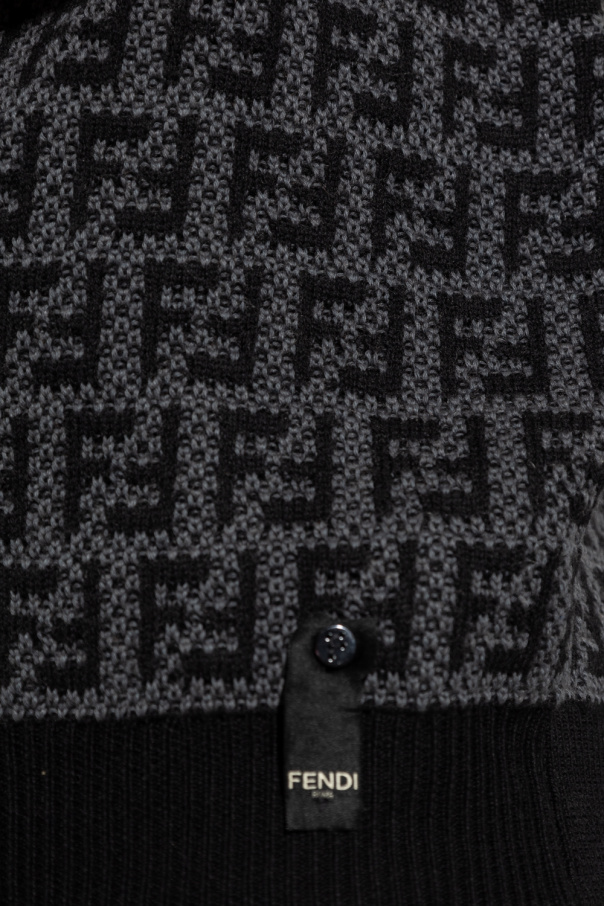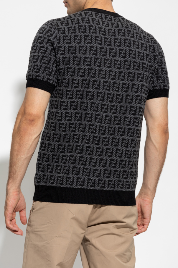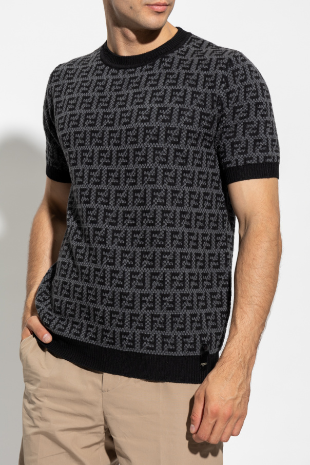Grey and black crewneck sweater from Fendi. Crafted from a wool, cashmere and cotton blend, this style showcases an embroidered FF monogram motif, short sleeves and ribbed details on the collar, bottom hem and cuffs.