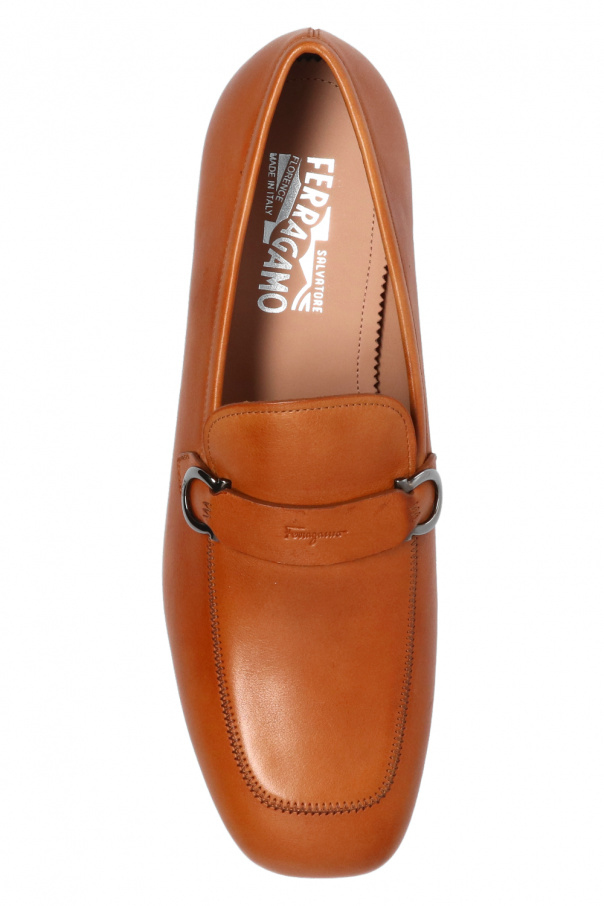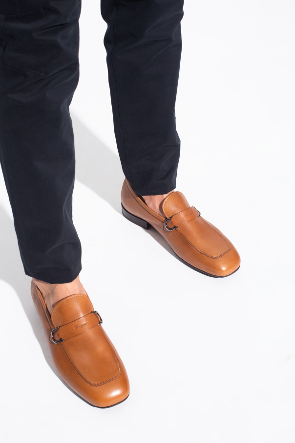 Brown ‘Nowell’ moccasins from Salvatore Ferragamo. Crafted from calf leather, this pair features an embossed logo, grey logo appliqué and dark brown rubber sole.