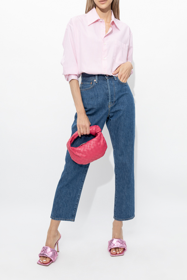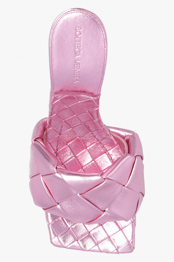 Pink ‘Lido’ slides from Bottega Veneta. Crafted from leather with a metallic finish, this square toe pair rests on a beige rubber-injected leather sole for increased stability.