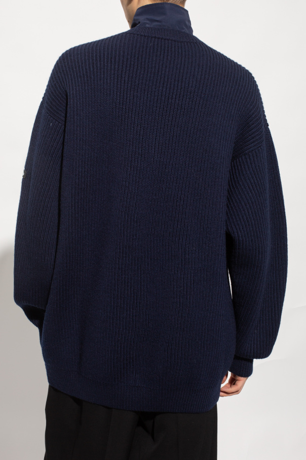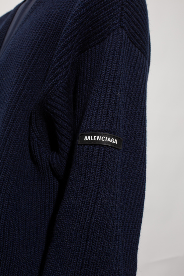 Navy blue sweater from Balenciaga. Crafted from a ribbed wool knit, this style features a half-zip closure and long sleeves – one of which has a branded tag.