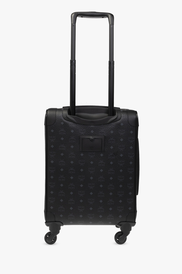 Black suitcase with rotary wheels from MCM. Crafted from the brand's signature ‘Visetos’ canvas with a grey monogram, this design secures with a two-way zipper and features a logo application accompanied with a zip pocket on the front, two half-round handles, one telescopic handle, black metal hardware and two separate compartments with two-way zippers and two zip pockets inside.