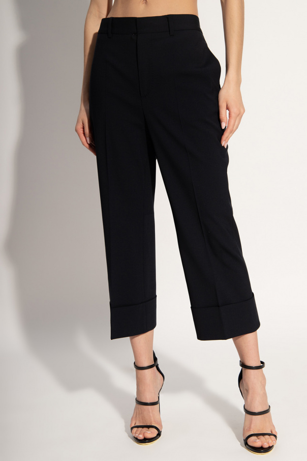 Navy blue pleat-front trousers from Dsquared2. Made of wool, this pair falls down with straight legs with upturned cuffs and features a zip fly with a button and a hook, a silver-tone logo plaque, two side seam pockets and two back button pockets.