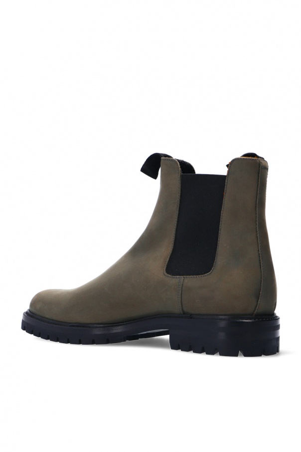 Grey ‘Winter Chelsea’ ankle boots from Common Projects. Designed in leather with side elastic panels, this winter-savvy pair is set on a treaded black rubber sole and showcases signature gold-tone graphic print.