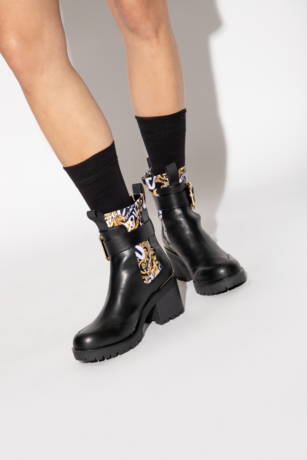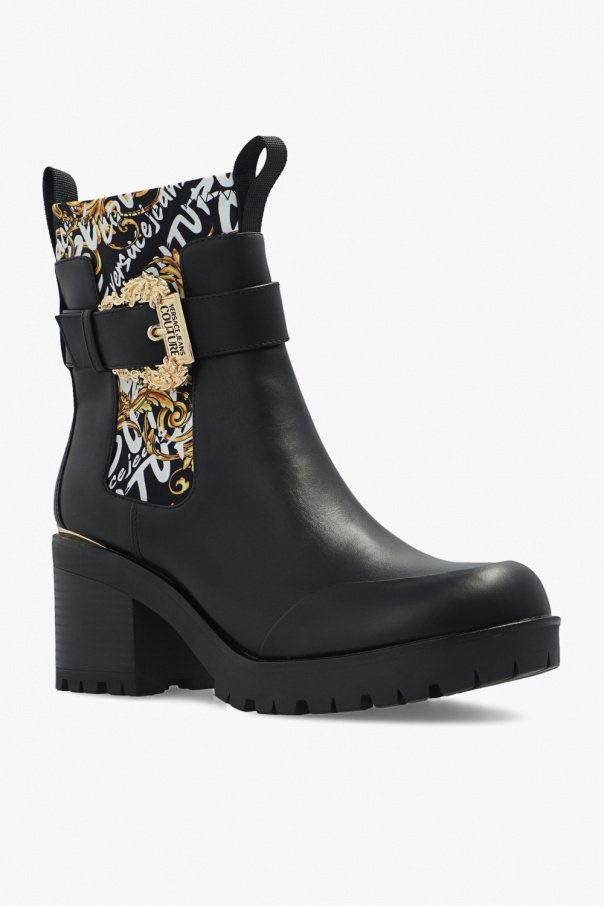 Black heeled ankle boots from Versace Jeans Couture. Crafted from faux leather, this pair features side inserts with the brand’s signature pattern in white, black and yellow, logo-embossed buckle in gold-tone and black as well as a rubber sole in black.