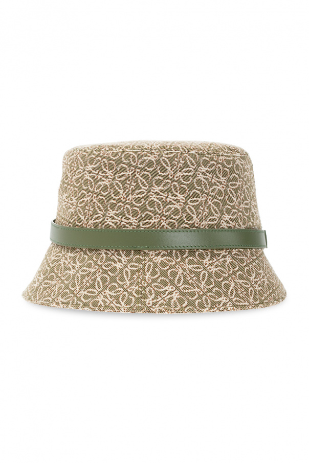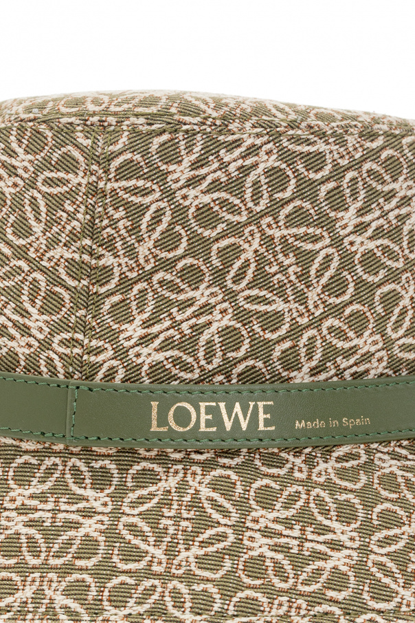 Green, cream and brown bucket hat from Loewe. This item features an embroidered monogram logo pattern and a strap with a gold-tone logo print.