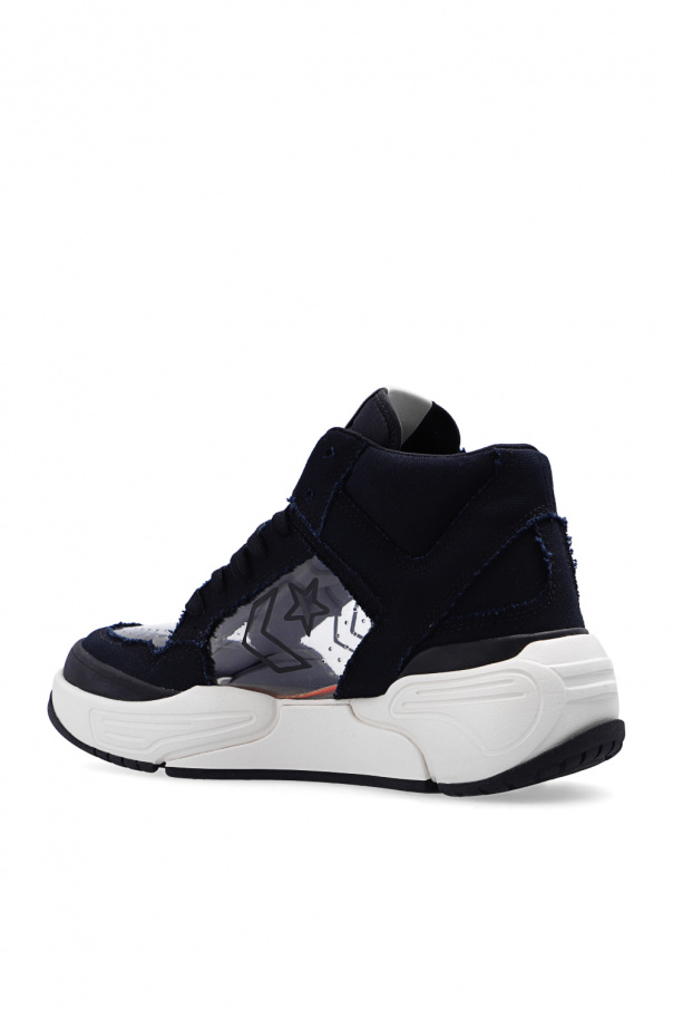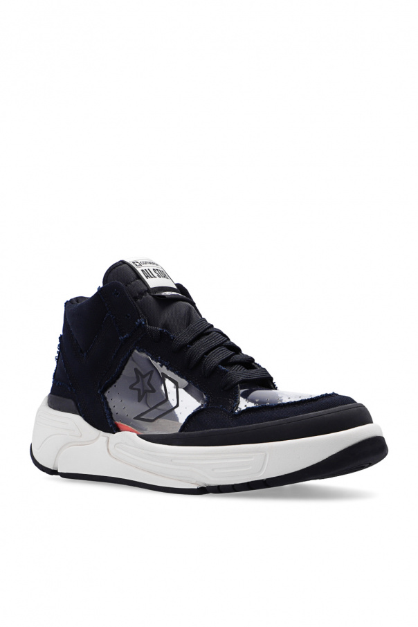 Black ‘Weapon CX’ high-top sneakers from Converse x Joshua Vides. This lace-up pair has an organic cotton upper, decorative stitching details, transparent TPU panels with a logo print and perforations, tongue patch with a logo, cork insole, injected EVA CX midsole and rubber outsole in black and cream. This limited-edition high-top sneaker was designed in collaboration with visual artist Joshua Vides. Vides’ style is monochromatic and closely related to street art. His works combine cartoon art with realism. The artist turns everyday objects into a sort of 2D sketchbooks.