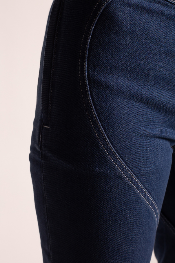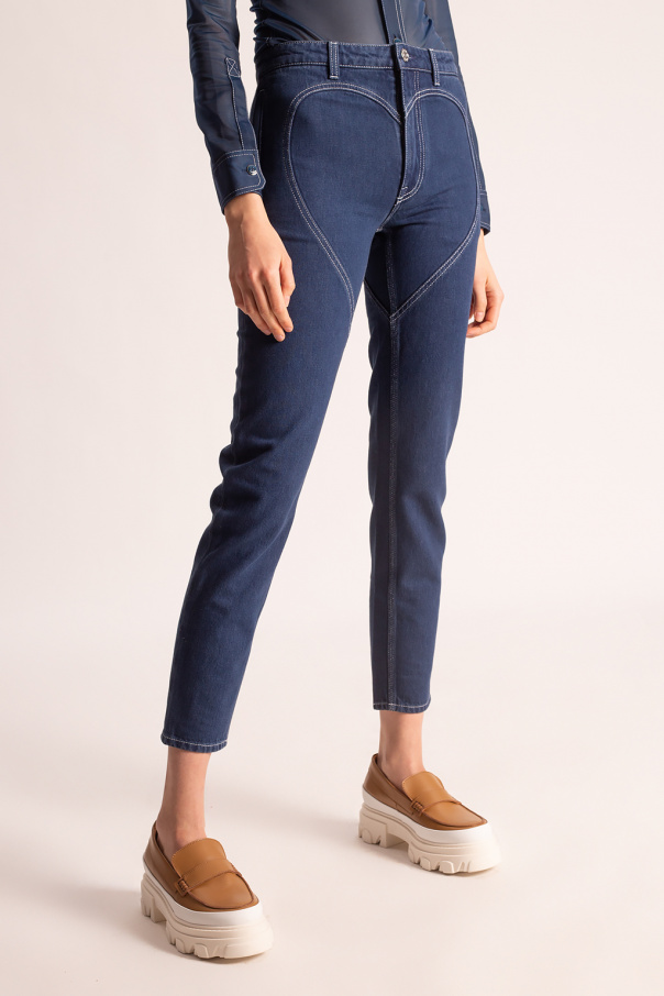Navy blue jeans from Burberry. Distinguished with white stitching details, this cotton-crafted pair falls to tapered legs and features a zip fly with a button, two slip pockets and two zipped pockets.