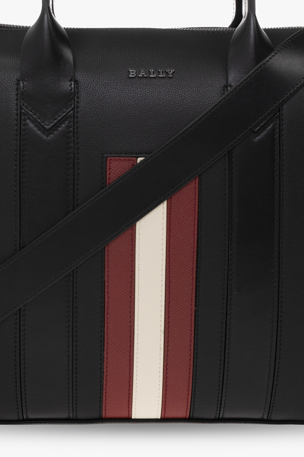 Black ‘Elter’ briefcase from Bally. Made of leather, this design fastens with a twi-way zipper and features a metal logo and the brand's signature red-white-red stripes on the front. It is complete with a back slip pocket, two half-round handles, a detachable and adjustable shoulder strap and one internal compartment with multiple pockets.