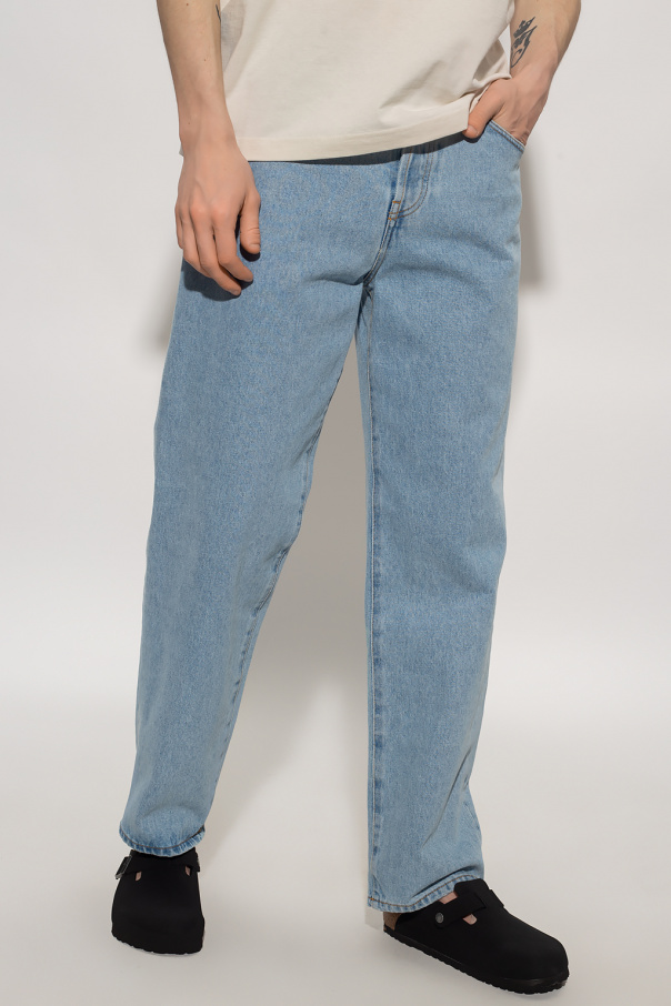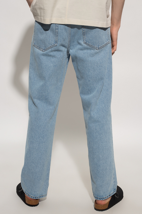 Blue ‘Morton’ jeans from The Row. Made of organic cotton, this pair falls down with slightly tapered legs and is complete with button cuffs and five slip pockets.