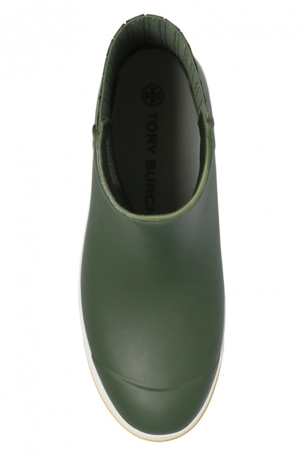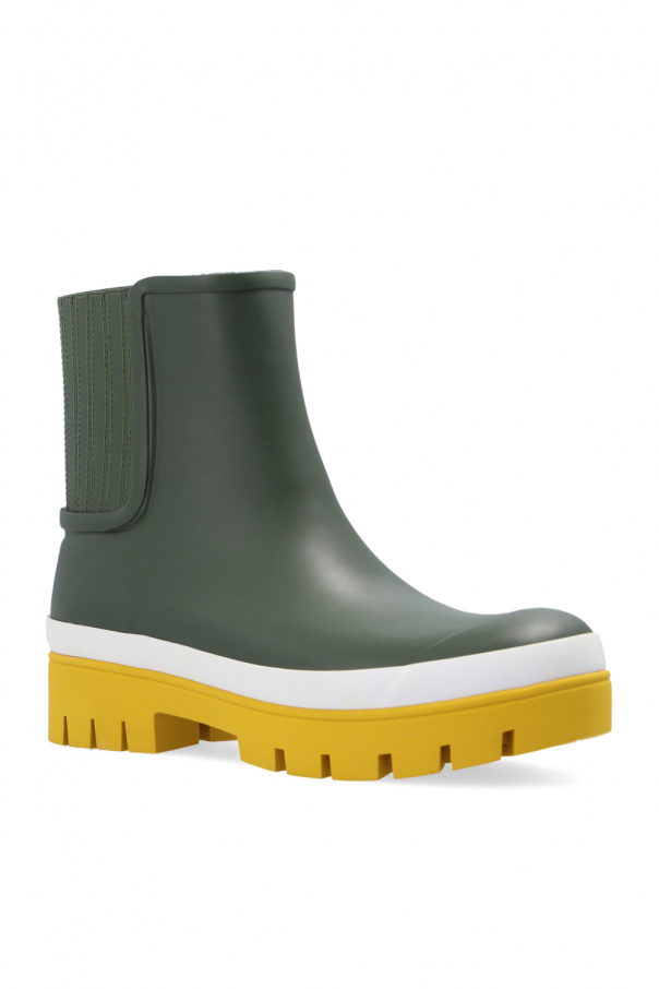 Green and white rain boots from Tory Burch. Made of rubber, this pair is complete with a raised logo and yellow rubber sole.