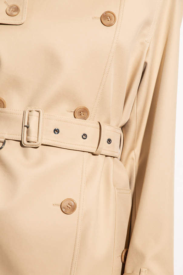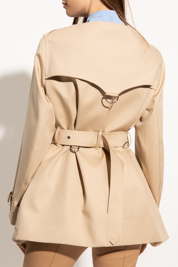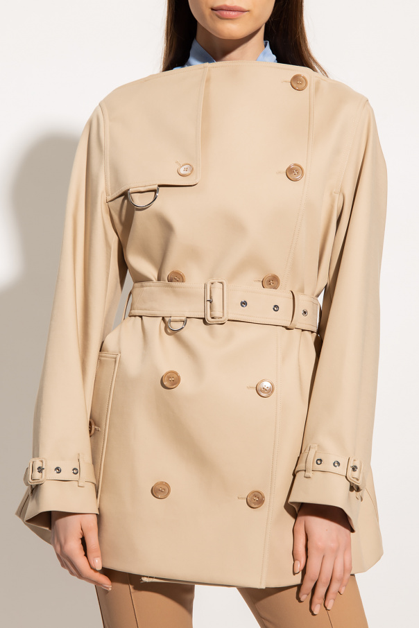 Short, beige, double-breasted coat from Burberry. Crafted from cotton, this garment features button fastenings, adjustable waist belt, decorative panel fastened with a button and metal appliqué, boat neck, two buttoned pockets, single rear vent and long sleeves with an adjustable tab.