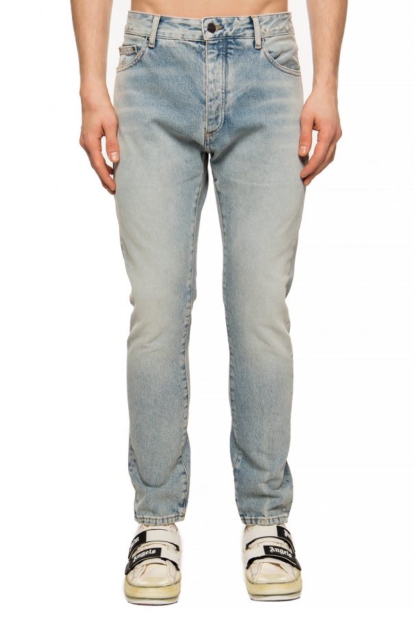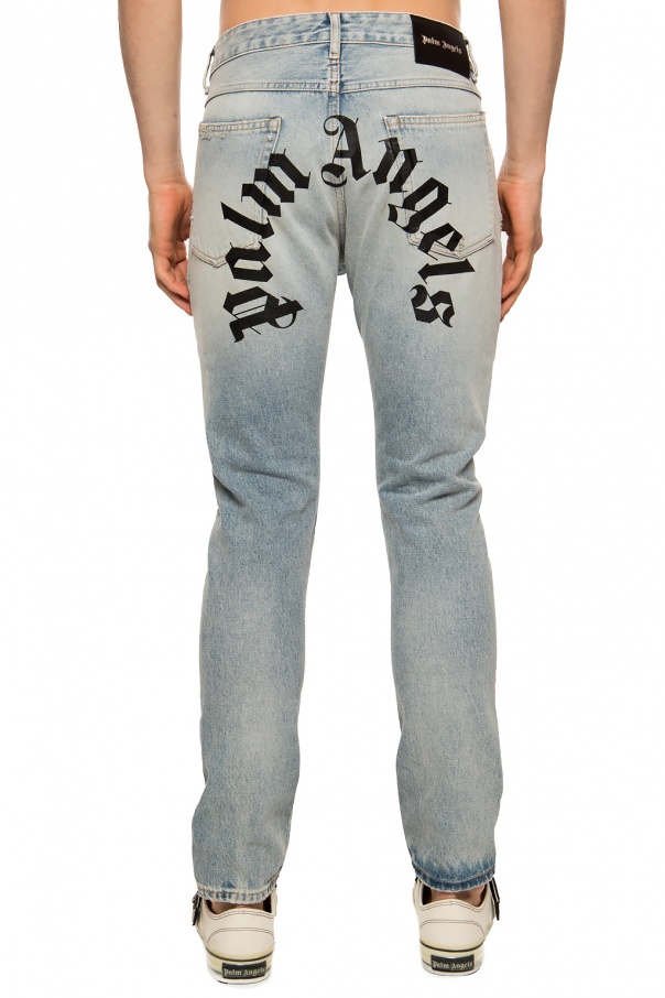 Blue stonewashed jeans from Palm Angels. Fastened via buttons. Embellished with printed black logo. Feature 4 slip pockets, printed black logo and tapered legs with raw cuffs.