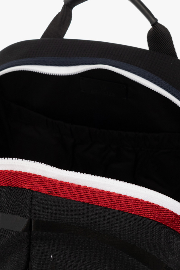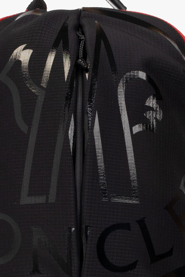 Black ‘Cut’ backpack from Moncler. Fastened with a two-way zip, this garment features the brand's signature stripes in red, white and navy, logo print, zipped front pocket, side pockets, half-round handle, adjustable shoulder strap, black metal hardware and one internal compartment with one slip pocket.