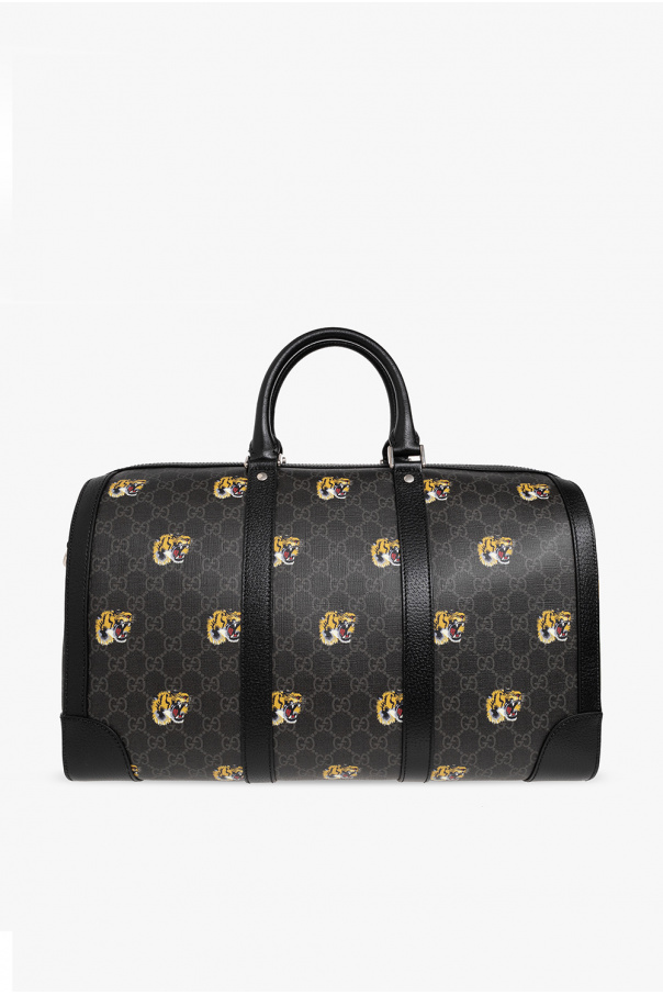 Black ‘Bestiary Medium’ holdall bag from Gucci. Fastened with a two-way zip, this design features a monogram pattern, multicolored animal motif, logo patch, two half-round handles, detachable and adjustable shoulder strap, silver-tone metal hardware and one internal compartment with one zip pocket.