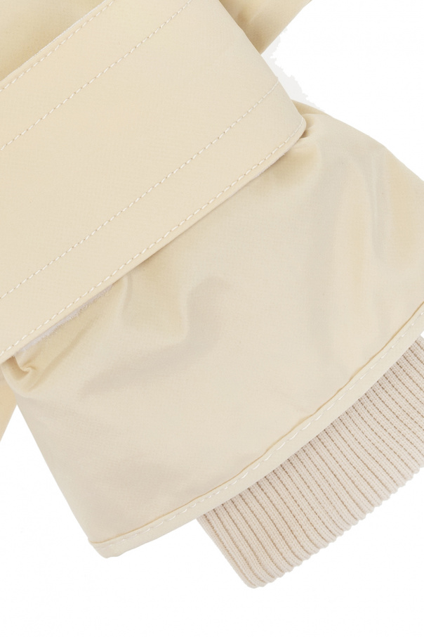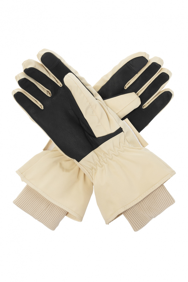 Cream ski gloves from Fendi. Crafted from cream ECONYL® regenerated nylon, this pair features a logo motif, an adjustable strap and rib-knit edges.