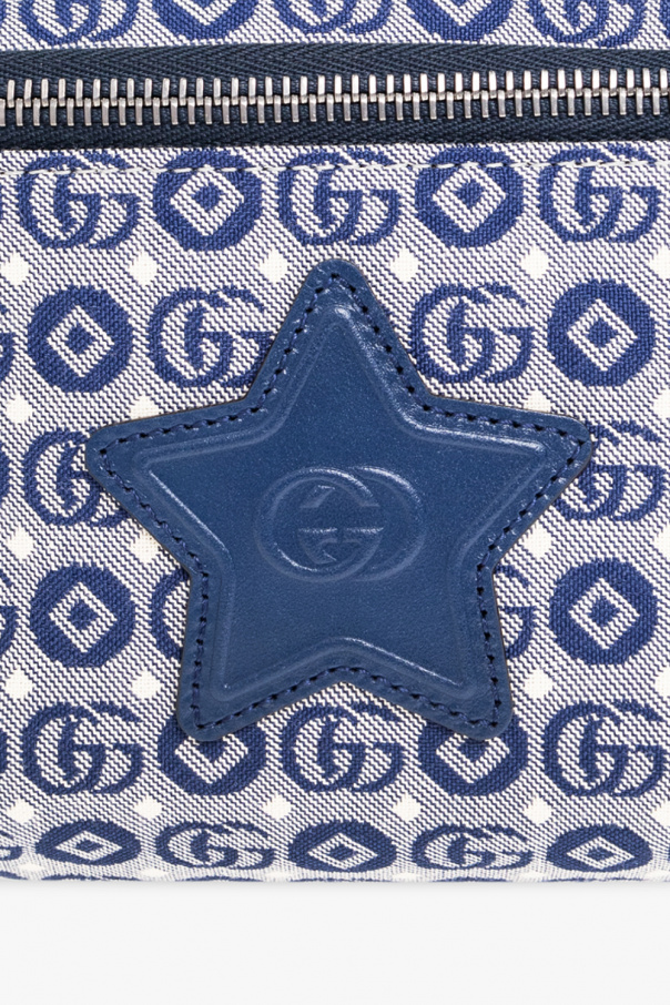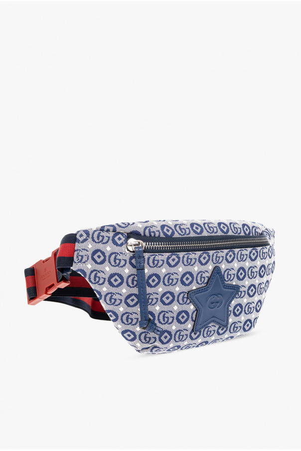 Navy and cream belt bag from Gucci Kids. Made of cotton, this model fastens with a zip and is decorated with a decorative monogram pattern and logo-embossed patch. It is complete with an adjustable belt with the iconic Web stripe and silver-tone metal hardware.