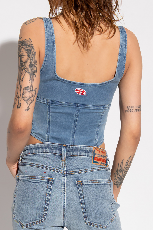 Blue ‘D-Gellert-Ne’ denim body with straps from Diesel. This garment features a side zip, snap fastenings and a logo patch at the back.