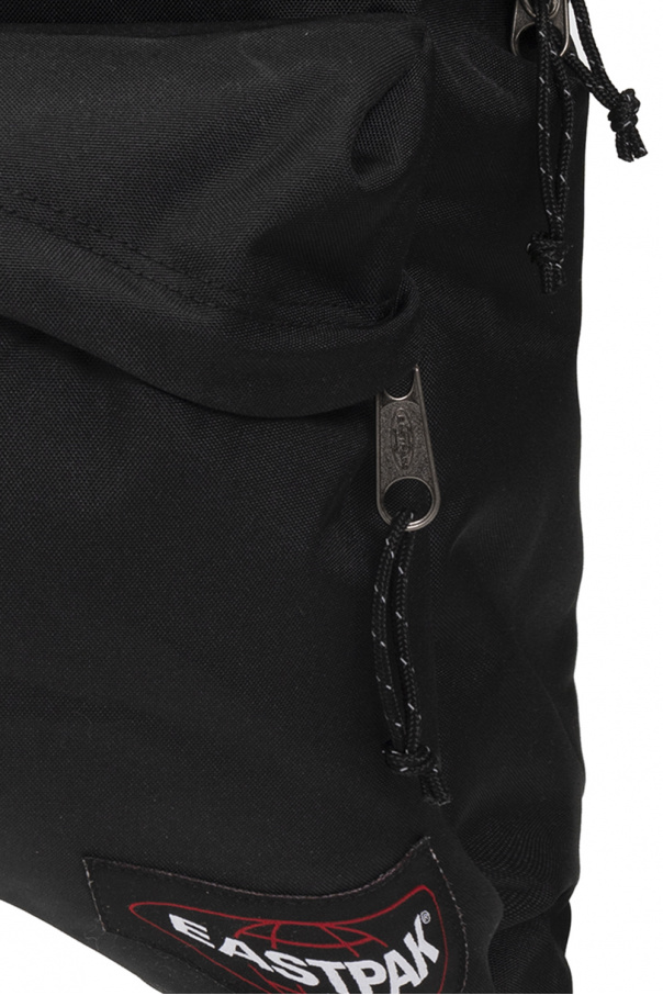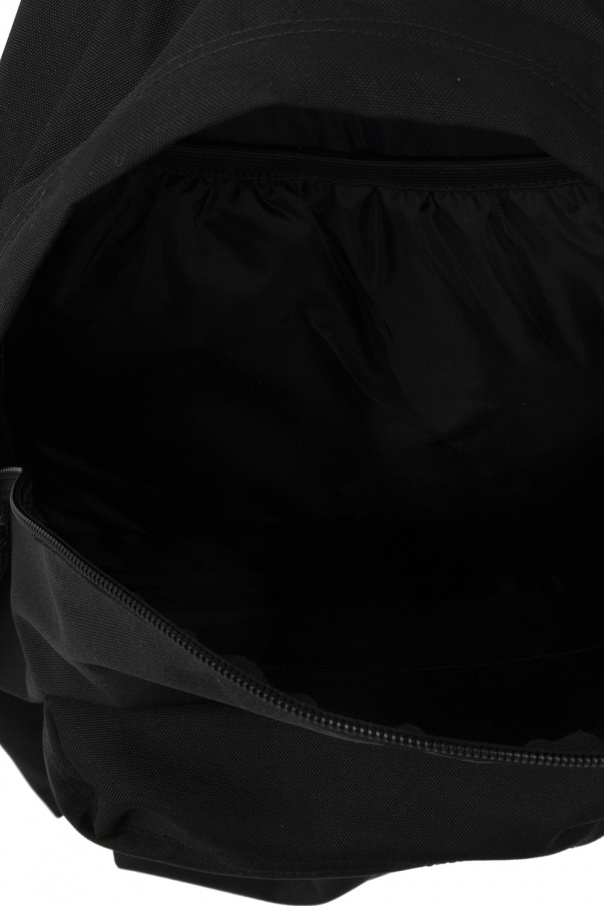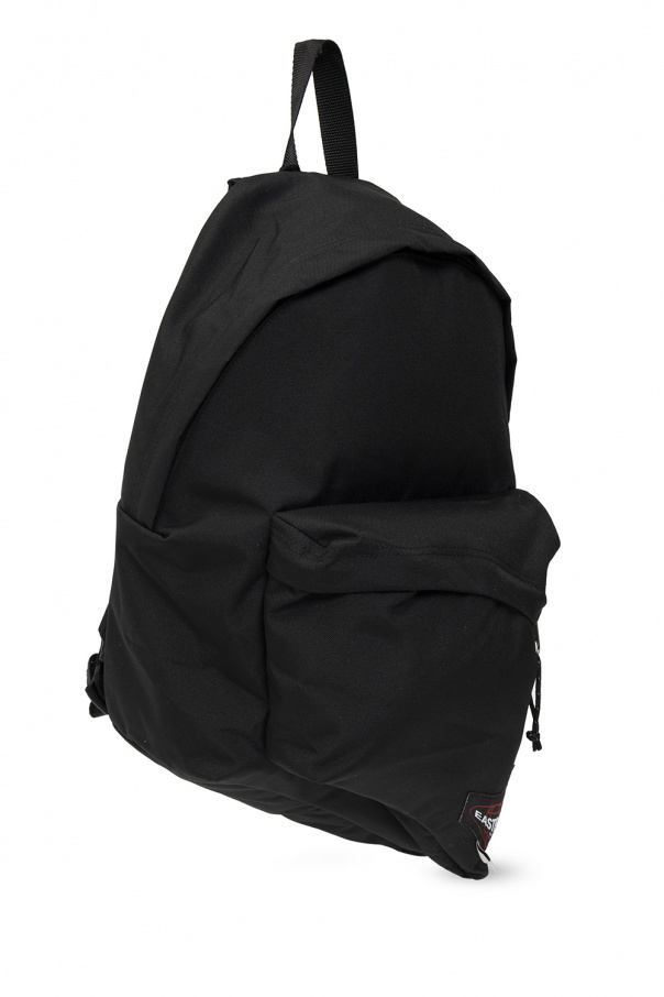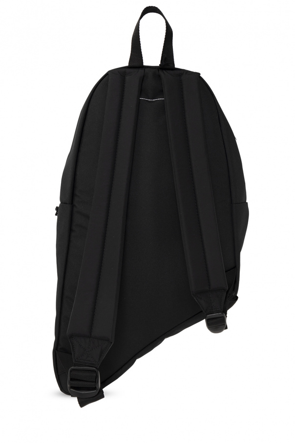 Black backpack from MM6 Maison Margiela x Eastpak. Designed with an asymmetrical silhouette, this item secures with a two-way zip and showcases logo patches, an external zip pocket on the front, a half-round handle, adjustable shoulder straps, silver-tone metal hardware and one internal compartment with a slip pocket.
