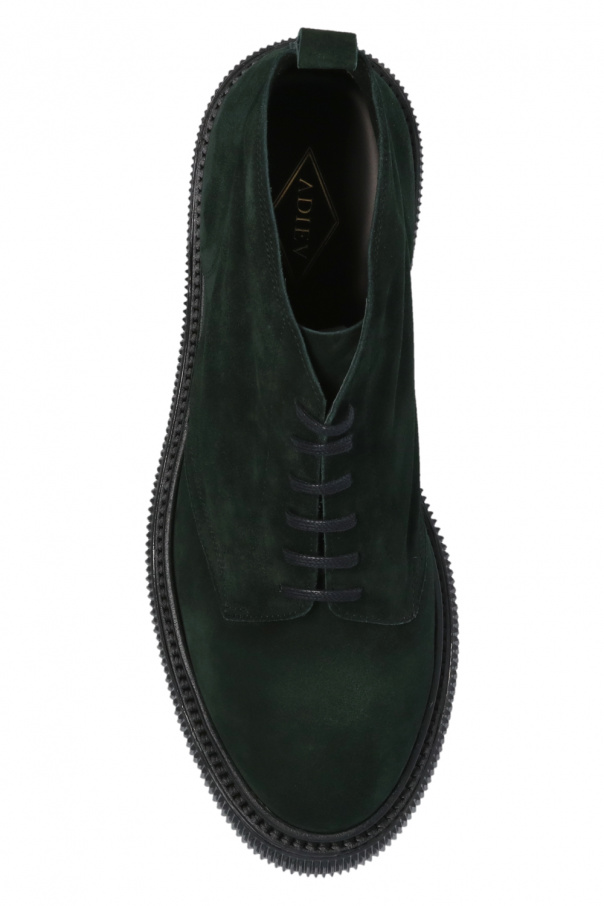 Dark green ‘Type 121’ boots from Adieu Paris. Crafted from suede, this lace-up pair rests on a black rubber sole.