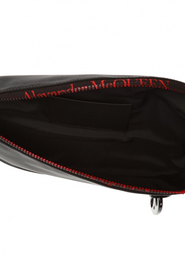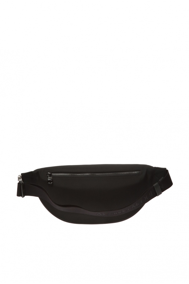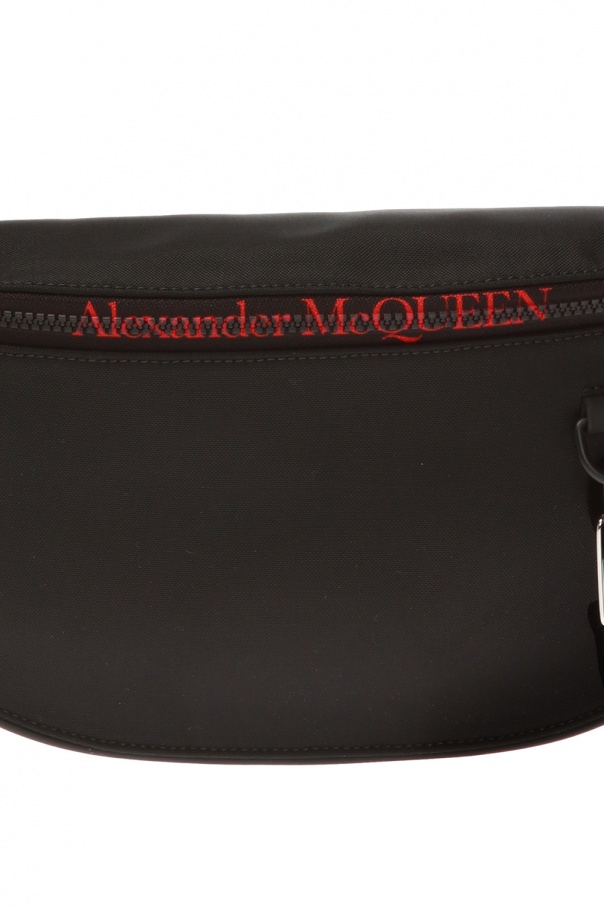 Black belt bag from Alexander McQueen. Zip fastening. Detachable lobster clasp and printed red logo on the front. Adjustable waist belt with logo.