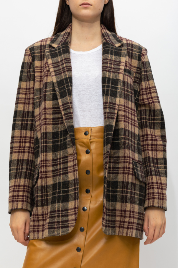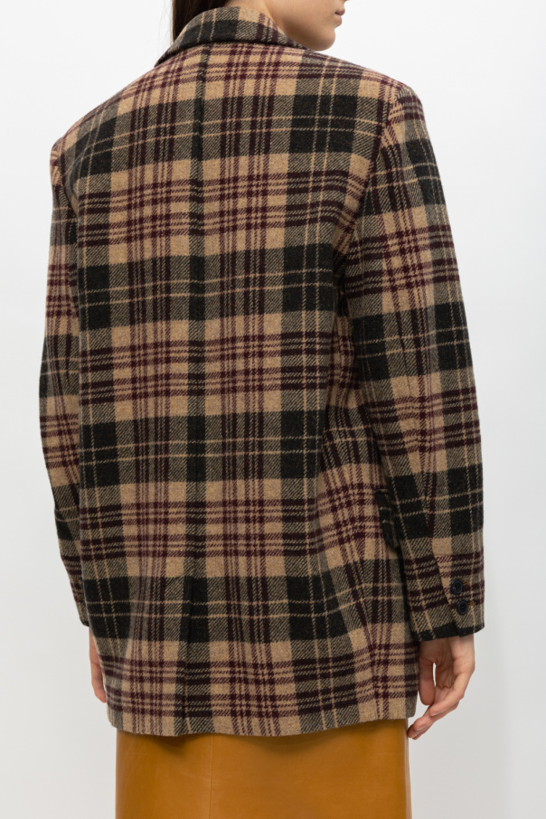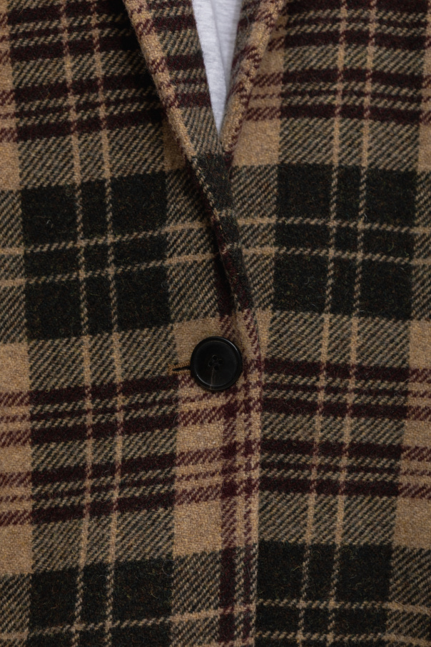 Beige, brown and maroon single-breasted ‘Cikaito’ coat from Isabel Marant Étoile. Fastened with buttons, this garment features a check pattern, notch lapels, two flap pockets, one slip pocket, single rear vent and long sleeves with buttoned cuffs.