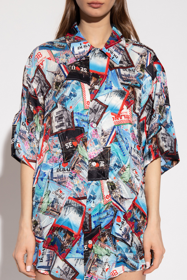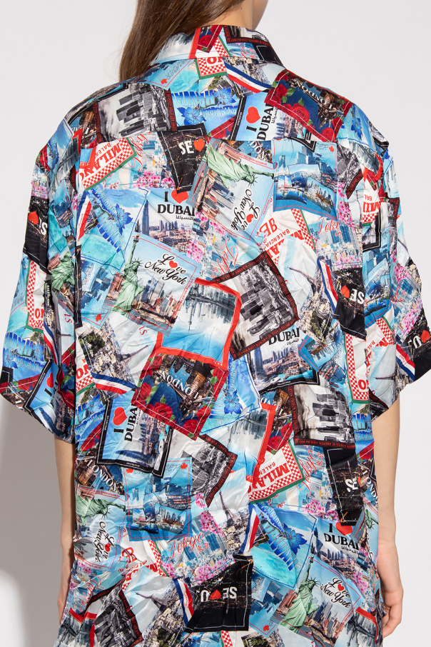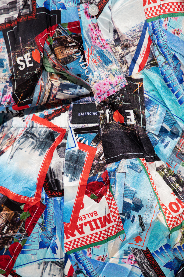 Multicoloured shirt from Balenciaga. Crafted from creased silk crepe with an ‘Allover Cities’ print, this style features a relaxed-fitting silhouette, button fastenings, short sleeves and a frontal pocket.
