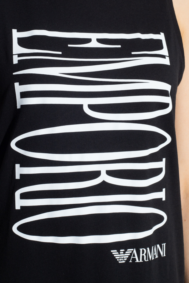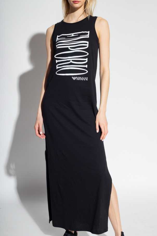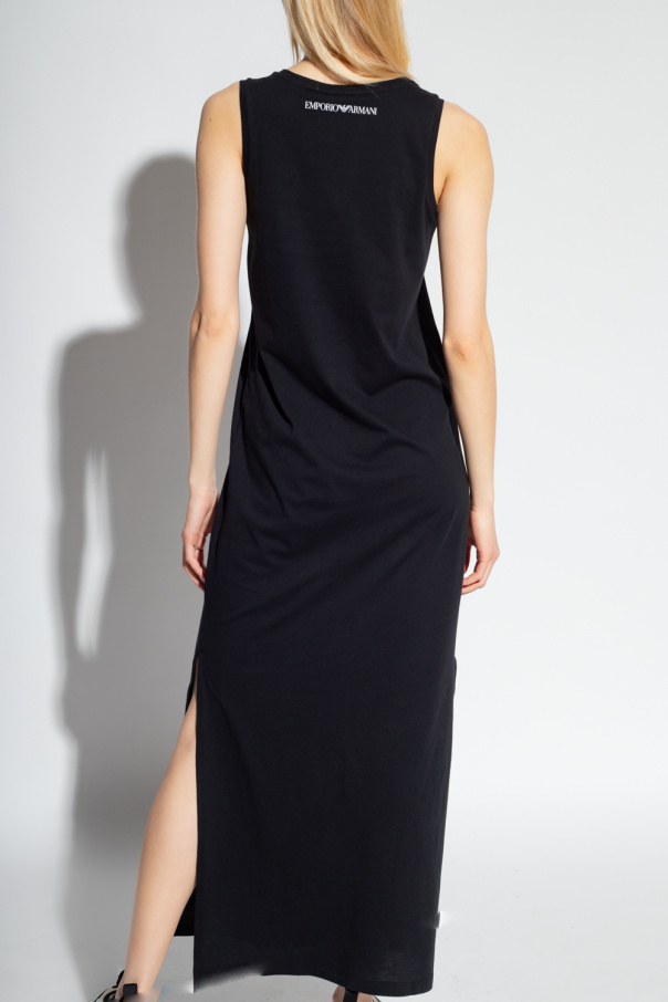 Long, black, sleeveless beach dress from Emporio Armani, the ‘Swimwear’ collection. Crafted from cotton as part of the ‘Armani Sustainability Project’ line using recycled materials, this design is complete with a white logo print and side slits.