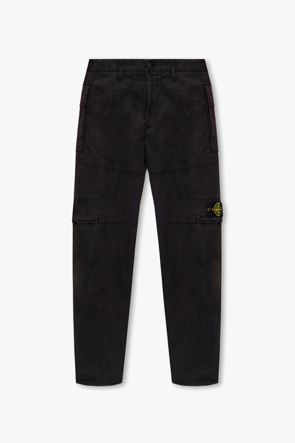 Black trousers from Stone Island. Made of cotton, this pair showcases the brand's signature logo patch in black, yellow and green. It is complete with a zip fly with a button, four zip pockets, two slip pockets and elasticated cuffs.