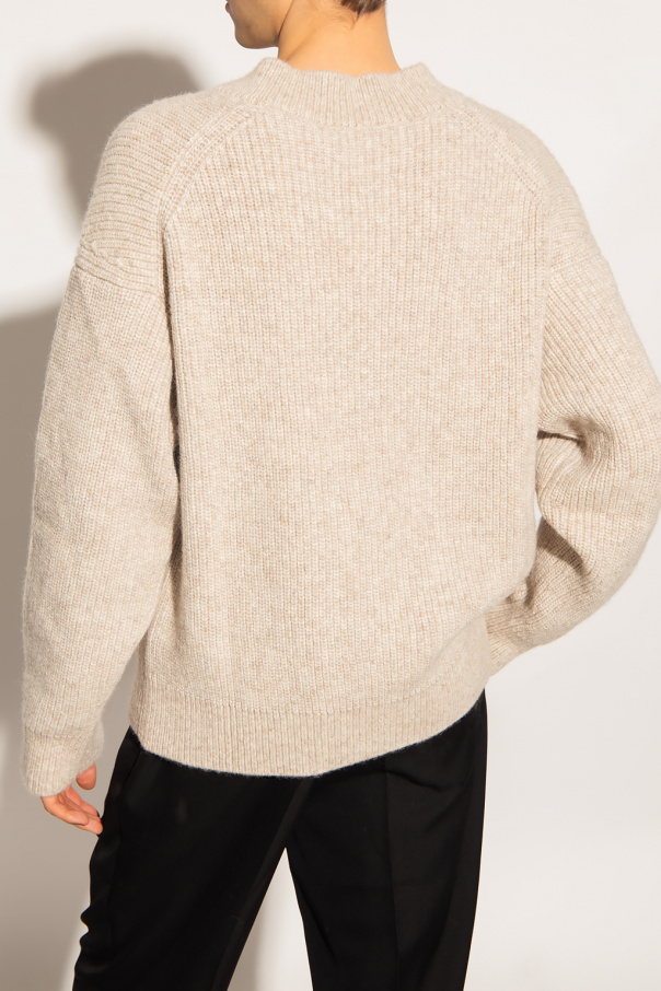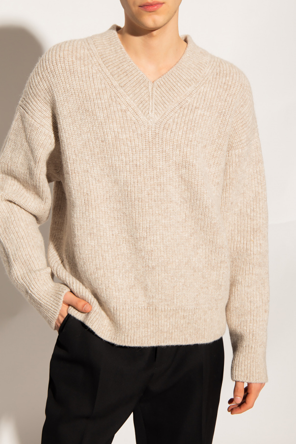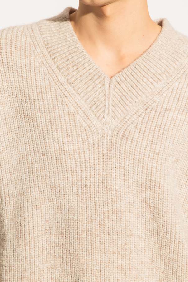Cream and beige V-neck sweater with ribbed trims from Nanushka. Crafted from an alpaca wool blend.