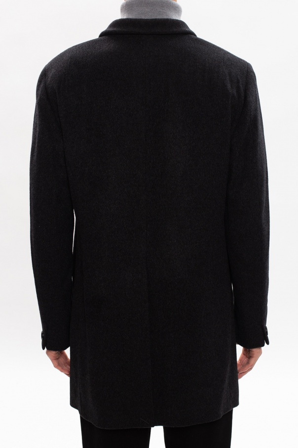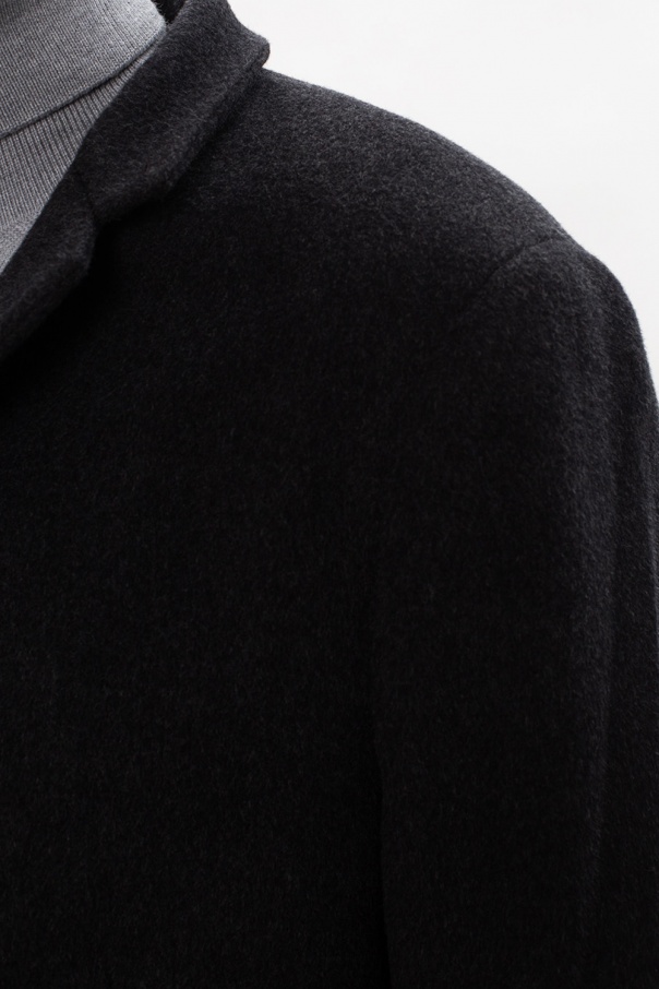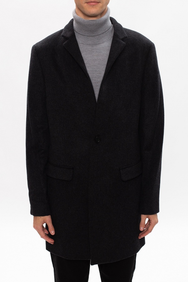 Navy blue ‘Manor’ coat from AllSaints. Crafted from wool, this exclusive piece of outerwear employs single button closing, two flapped pockets, band collar, long sleeves with button-fastened cuffs and a deep vent on the back.