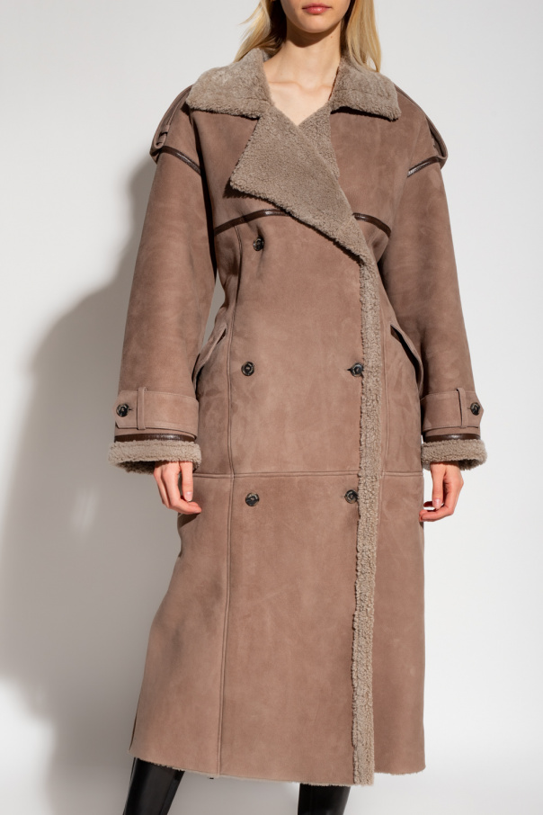 Long, brown ‘Jordan’ double-breasted shearling jacket from The Mannei. Crafted from sheep leather, this design features an oversized silhouette, button fastenings, elasticated panel at the back, epaulettes, two flap pockets, single rear vent and sheep fur trims at the collar and long sleeves.