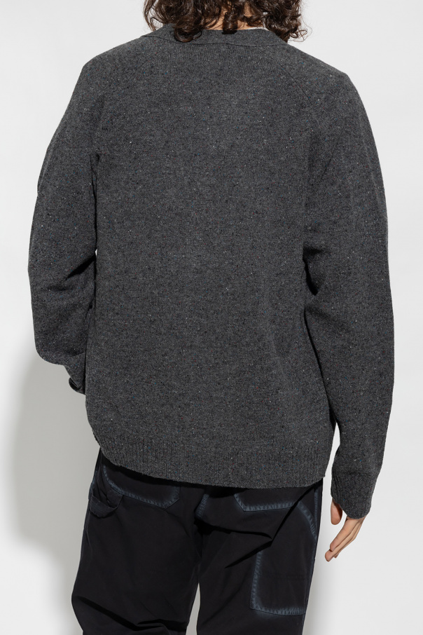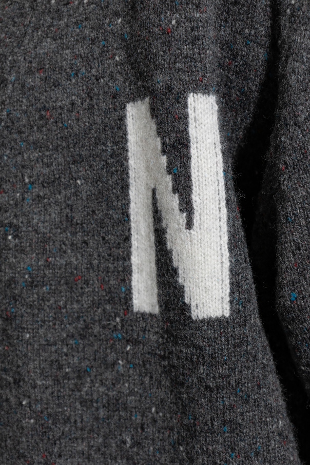Grey ‘Kasper’ cardigan from Norse Projects. Crafted from wool, this style features a V-neckline, button fastenings, long sleeves and an embroidered white logo on the front.