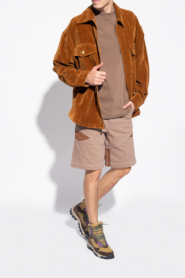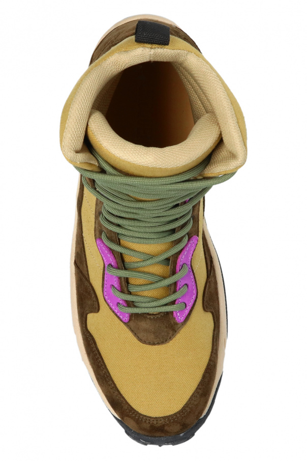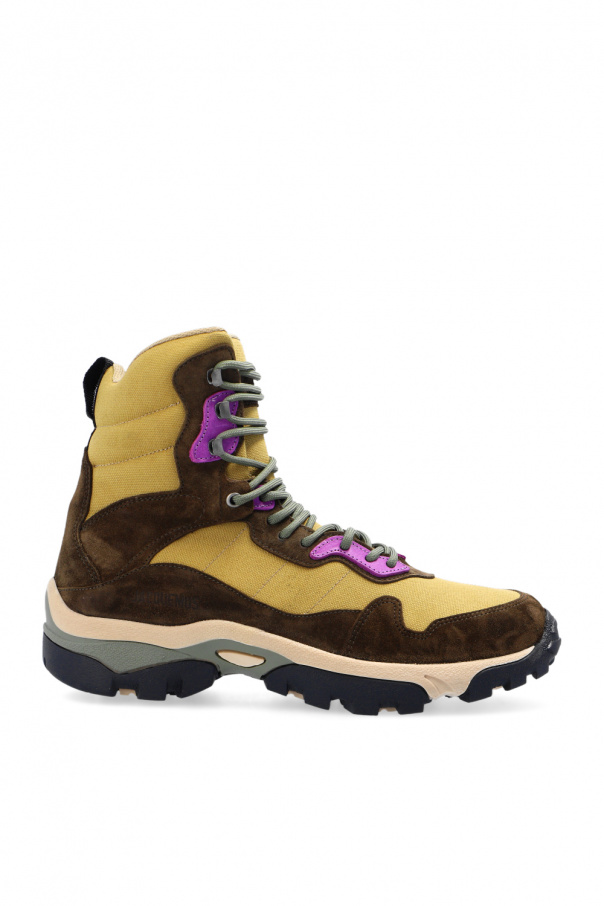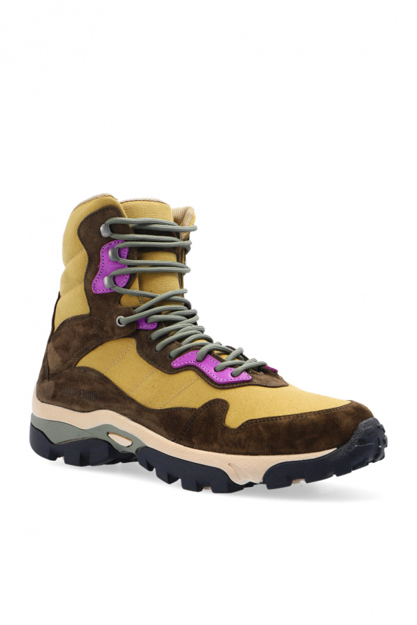 Green, purple and brown ‘Terra’ ankle boots from Jacquemus. Crafted from leather and fabric, this lace-up model sits on a black rubber sole and features an embossed logo pattern.