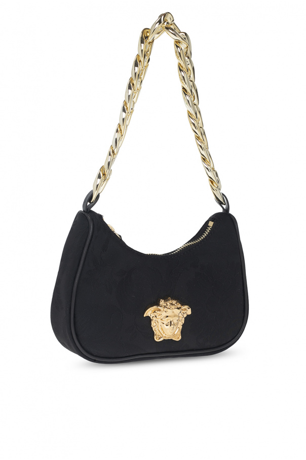 Black shoulder bag from Versace Kids. Made of fabric decorated with the brand's signature Barocco print, this design features a zip fastening, an iconic Medusa application on the front, a chain strap, gold-tone metal hardware and one internal compartment.