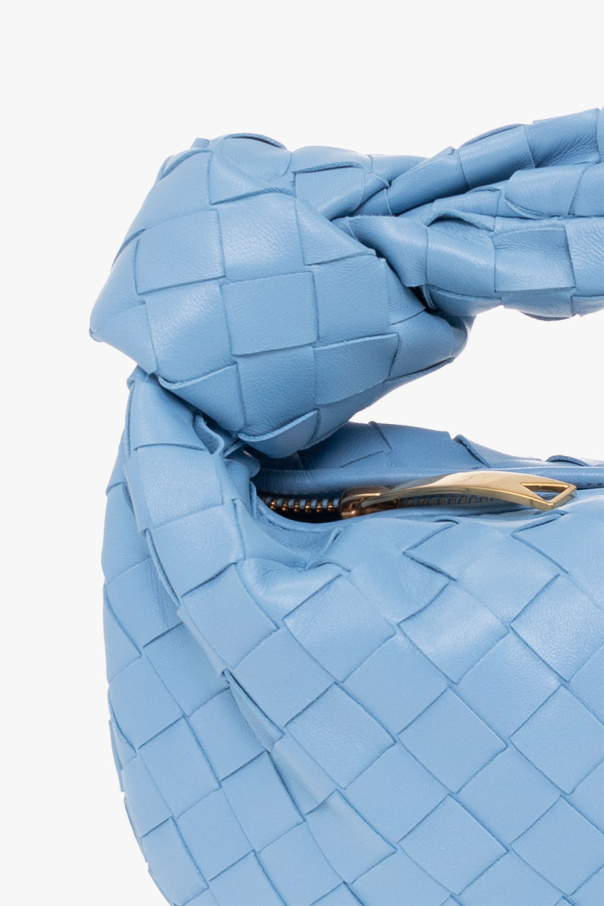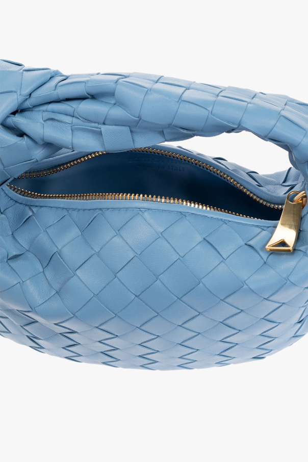 Blue ‘Jodie Mini’ handbag from Bottega Veneta. Crafted from lamb leather and calf leather with the brand's signature Intrecciato weave, this design fastens with a zip and features a half-round handle, gold-tone metal hardware and one internal compartment.