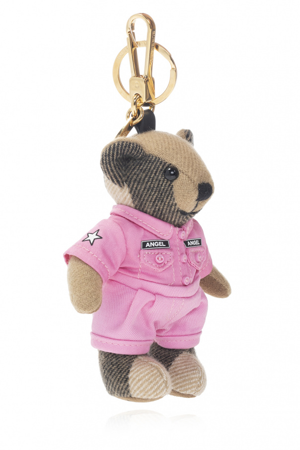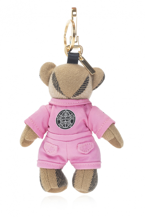 Brown and pink Teddy bear keyring from Burberry. A lobster clasp and a loop are embellished with an engraved logo.