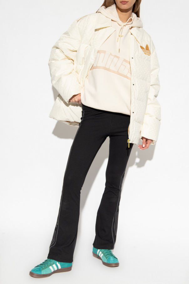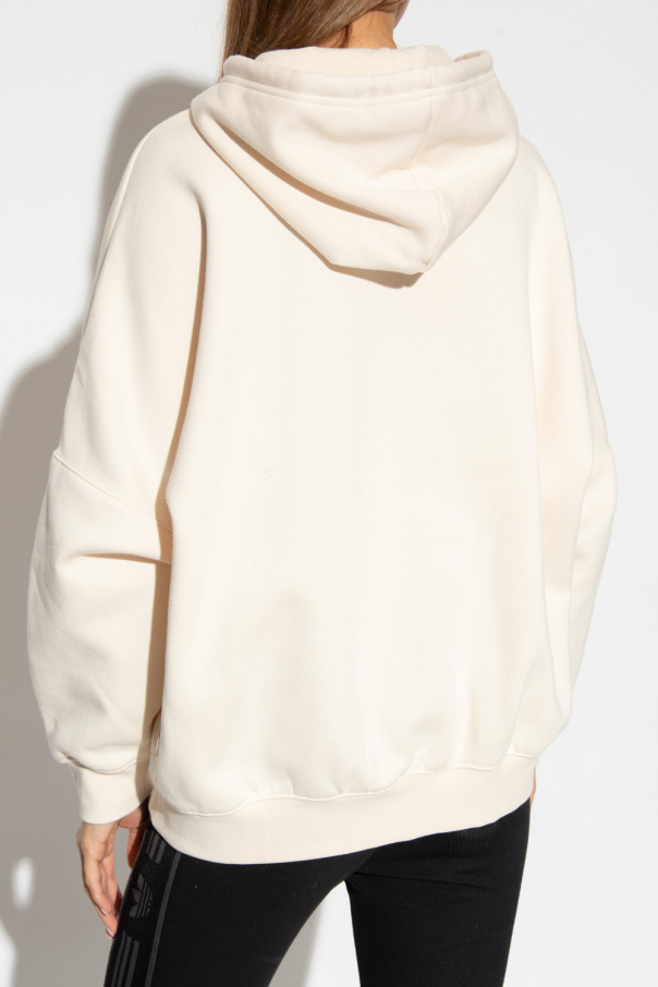 Cream hoodie from ADIDAS Originals, the ‘Ski Chic’ collection. Made of a blend of BCI-certificated organic cotton and recycled materials, this garment features a beige insert with a logo print, rubber Trefoil patch in gold-tone, drawstring hood and ribbed trims at the hem and cuffs.