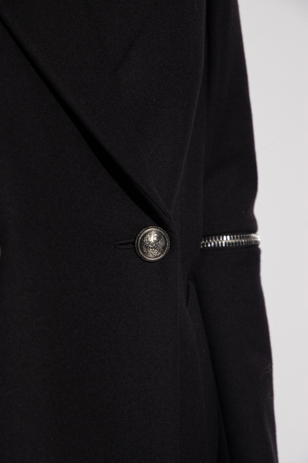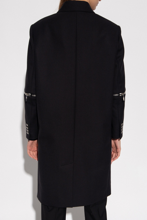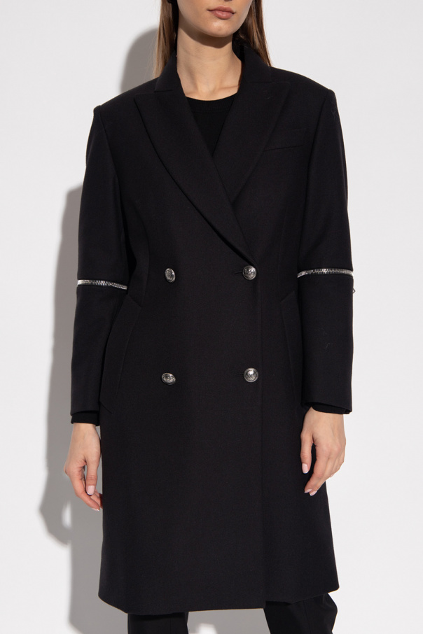 Black double-breasted coat from Alexander McQueen. Made of wool, this garment features decorative buttons, three front pockets, single rear vent, peak lapels and cuffs with zips and buttons.