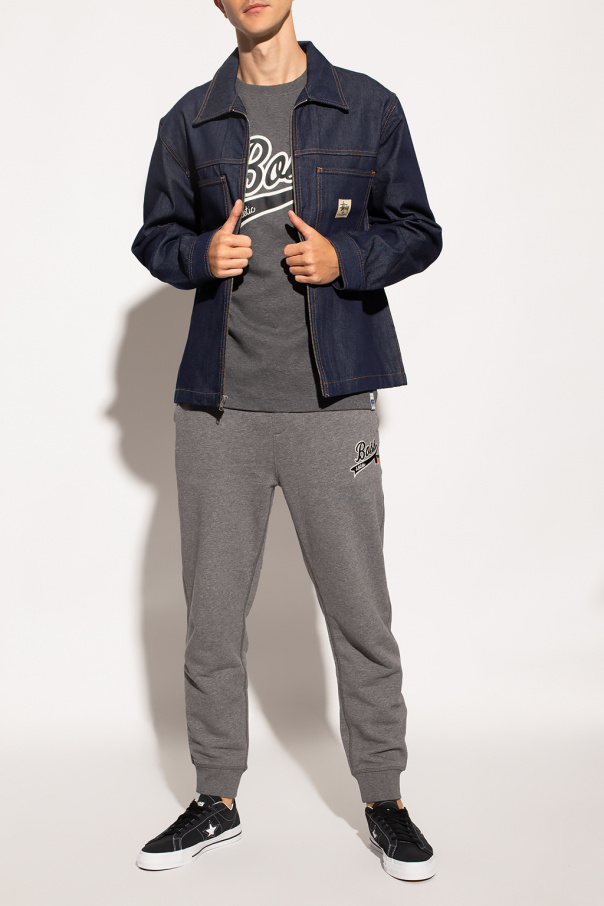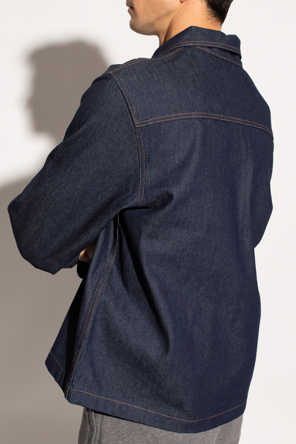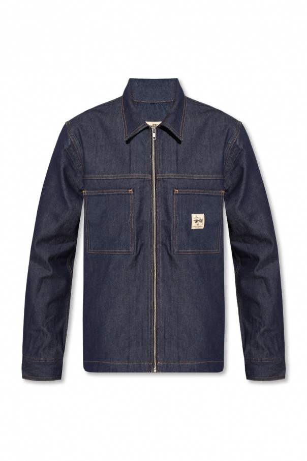 Navy blue denim jacket from Stussy. Emblazoned with a beige and black logo patch, this style features zip and button fastenings, long sleeves and two slip pockets.