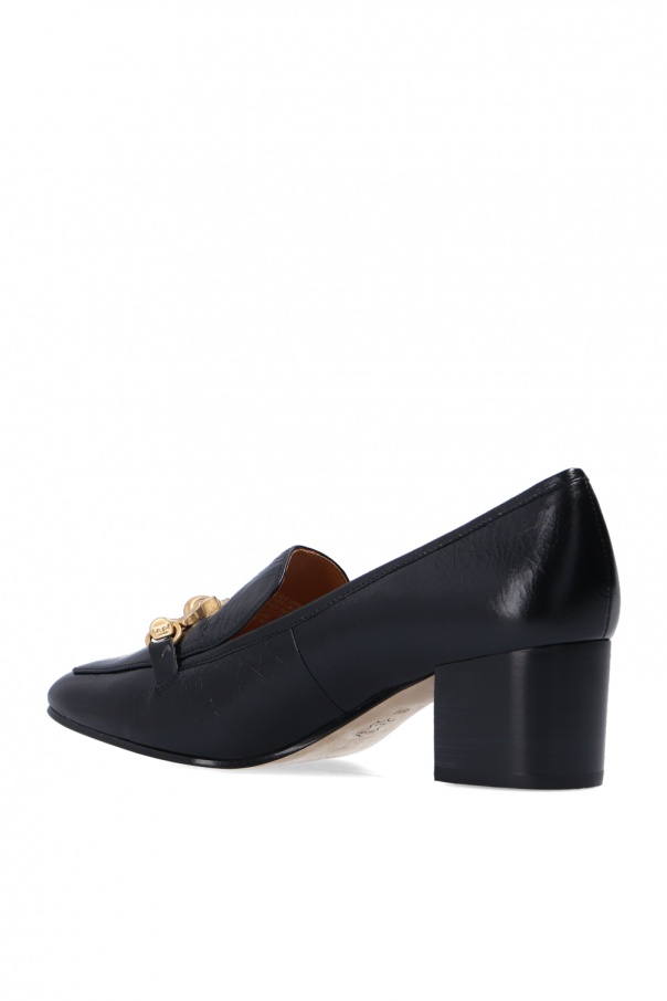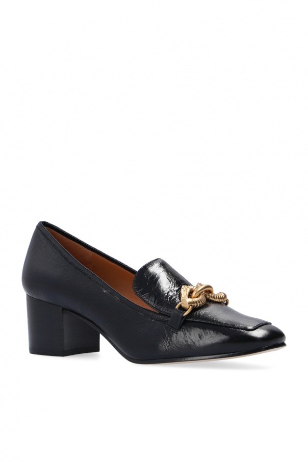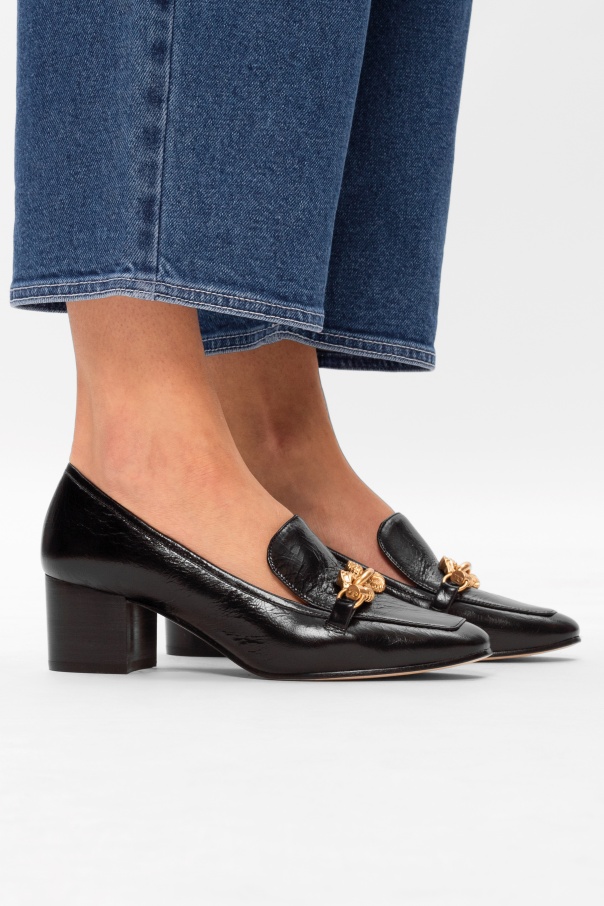 Black moccasins from Tory Burch. Crafted from patent leather, these shoes rest on a beige and black sole and are decorated with a metal logo detail in gold-tone.