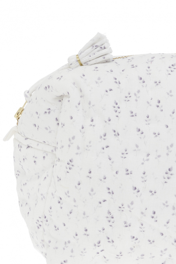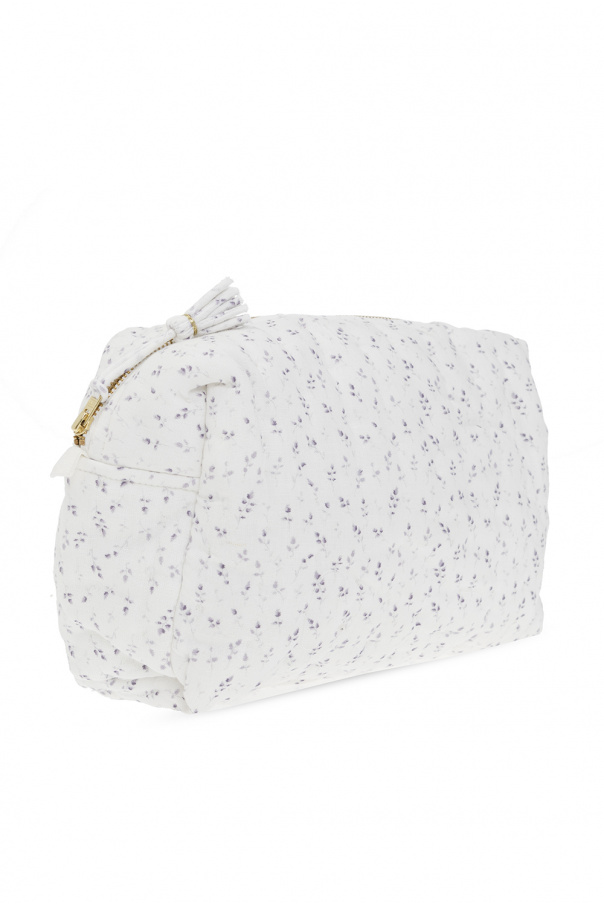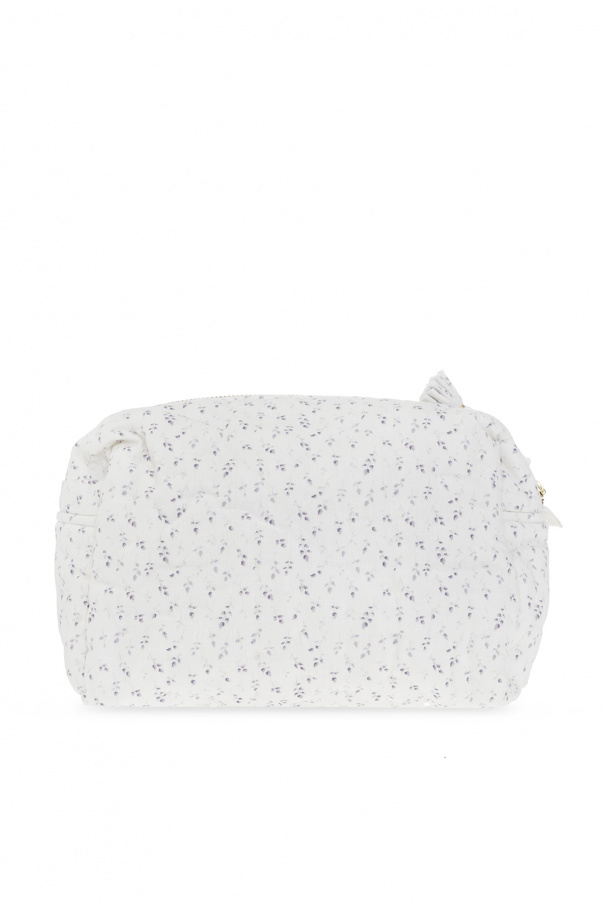 White wash bag from Bonpoint. Crafted from cotton, this design fastens via a zip and showcases a purple floral motif. It is complete with gold-tone metal hardware and one internal compartment with four slip pockets.
