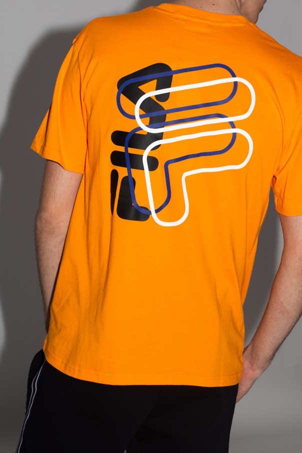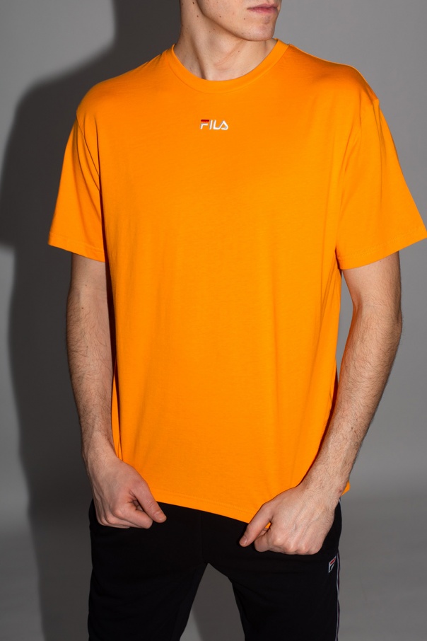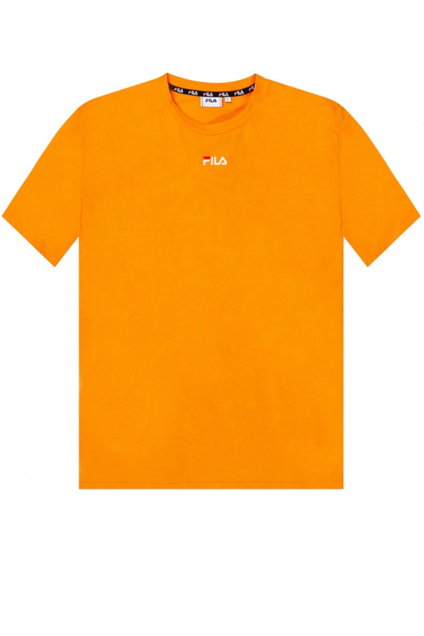 Orange T-shirt from Fila. Crafted from cotton, this short design features a ribbed round neck and embroidered logo pattern in white and red.